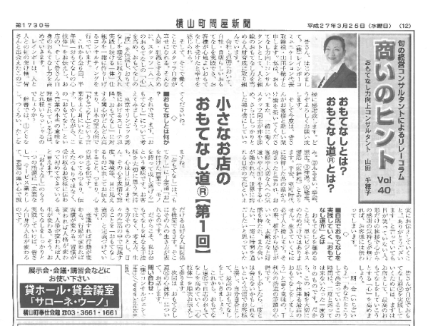 横山町問屋新聞2015年3月25日号 横山町問屋新聞2015年3月25日号にて、 旬の経営コンサルタントによるリレーコラム商いのヒントVol.40 『小さなお店のおもてなし道®【第1回】』執筆いたしました。